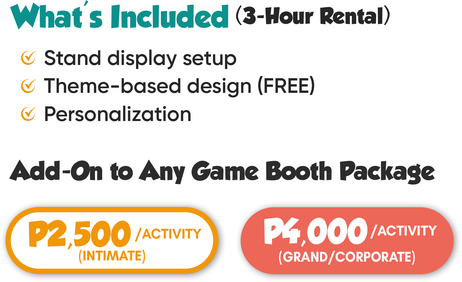 Booth customization is available for an additional fee.Customization of booths are subject for additional fees.Transpo fee applies